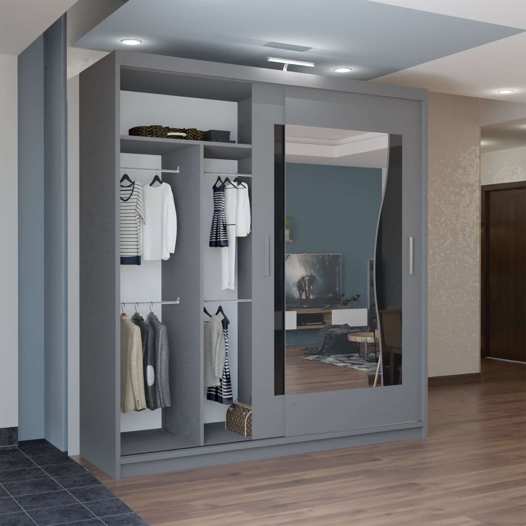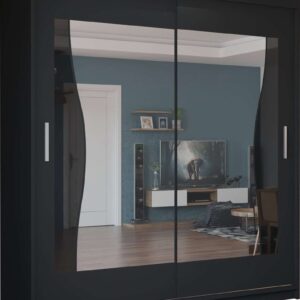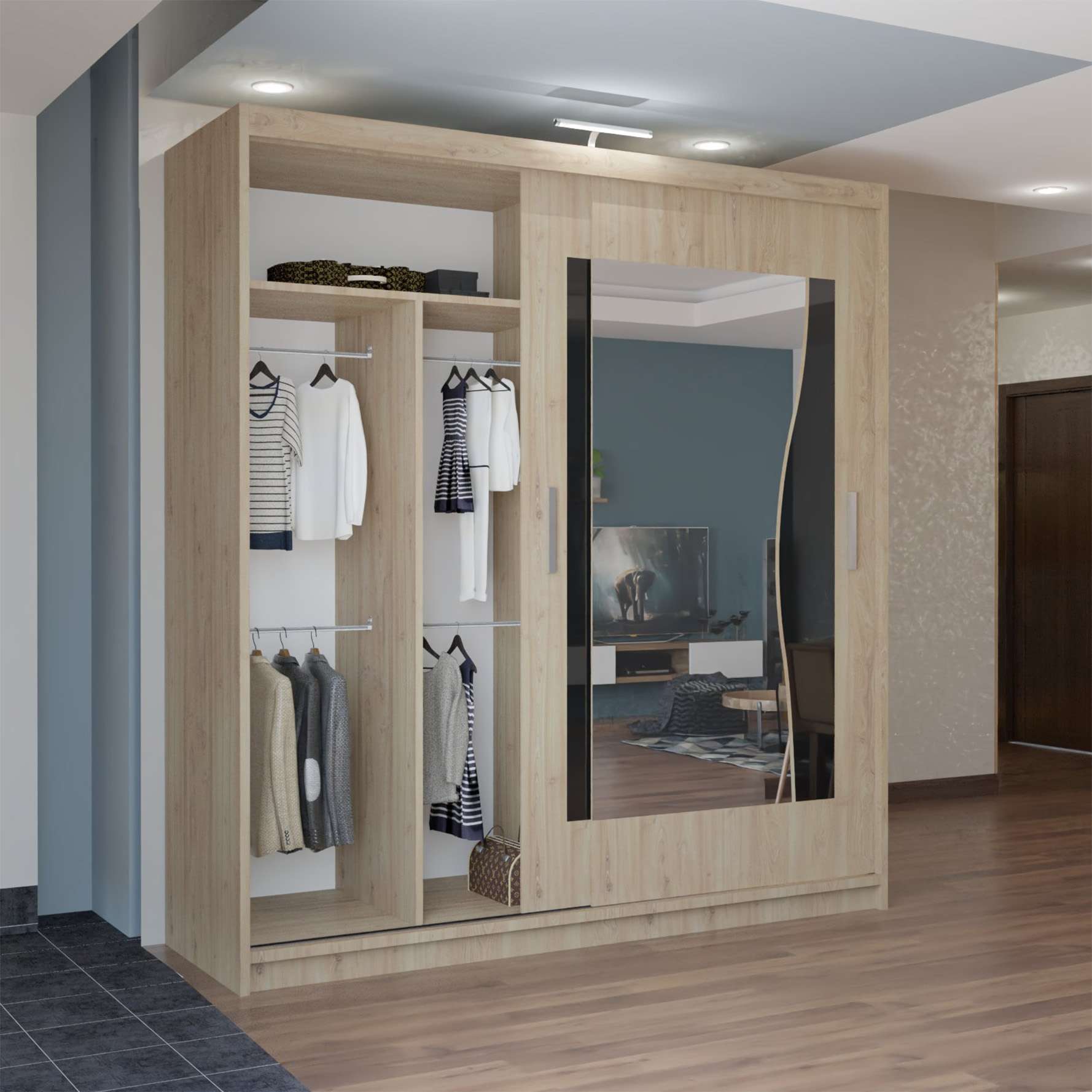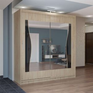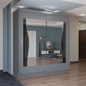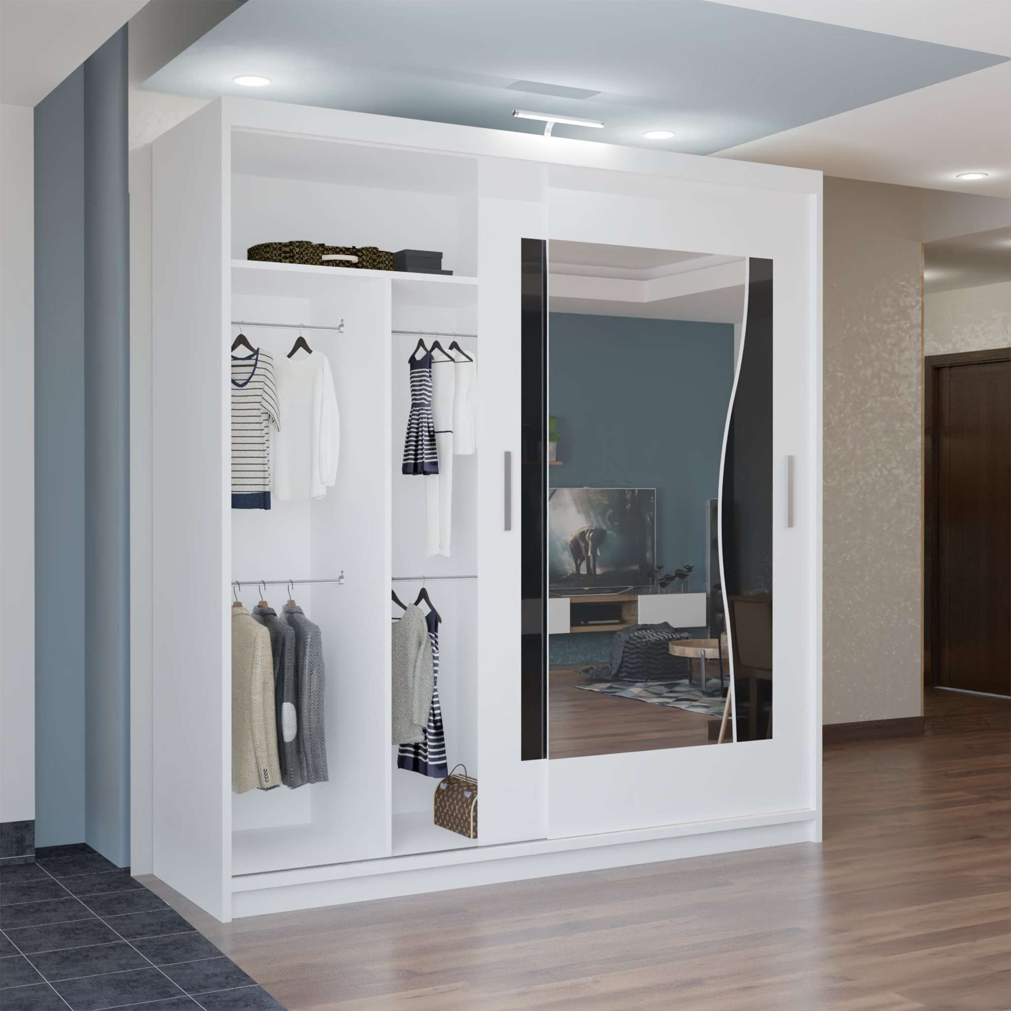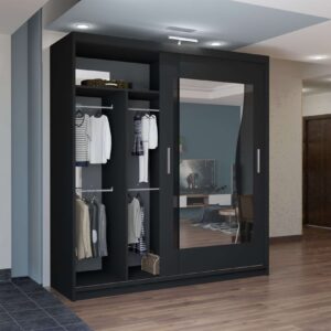 With sliding mirror doors, bright LED illumination and large internal sections, it keeps clothing organised while enhancing room appearance.
