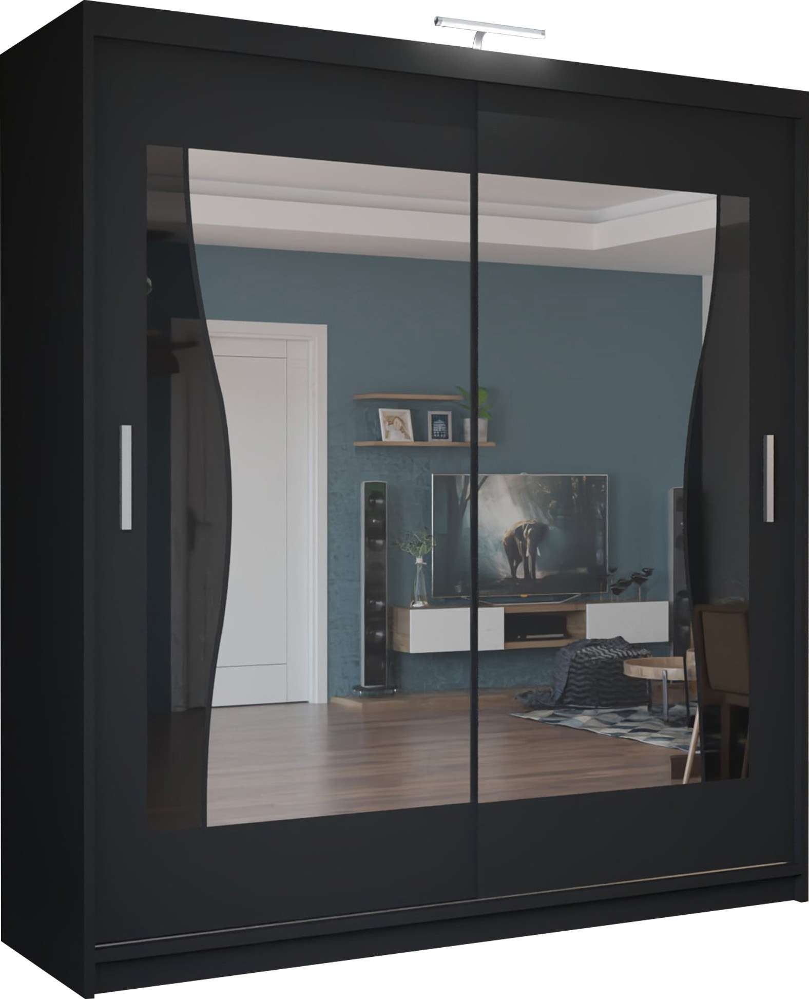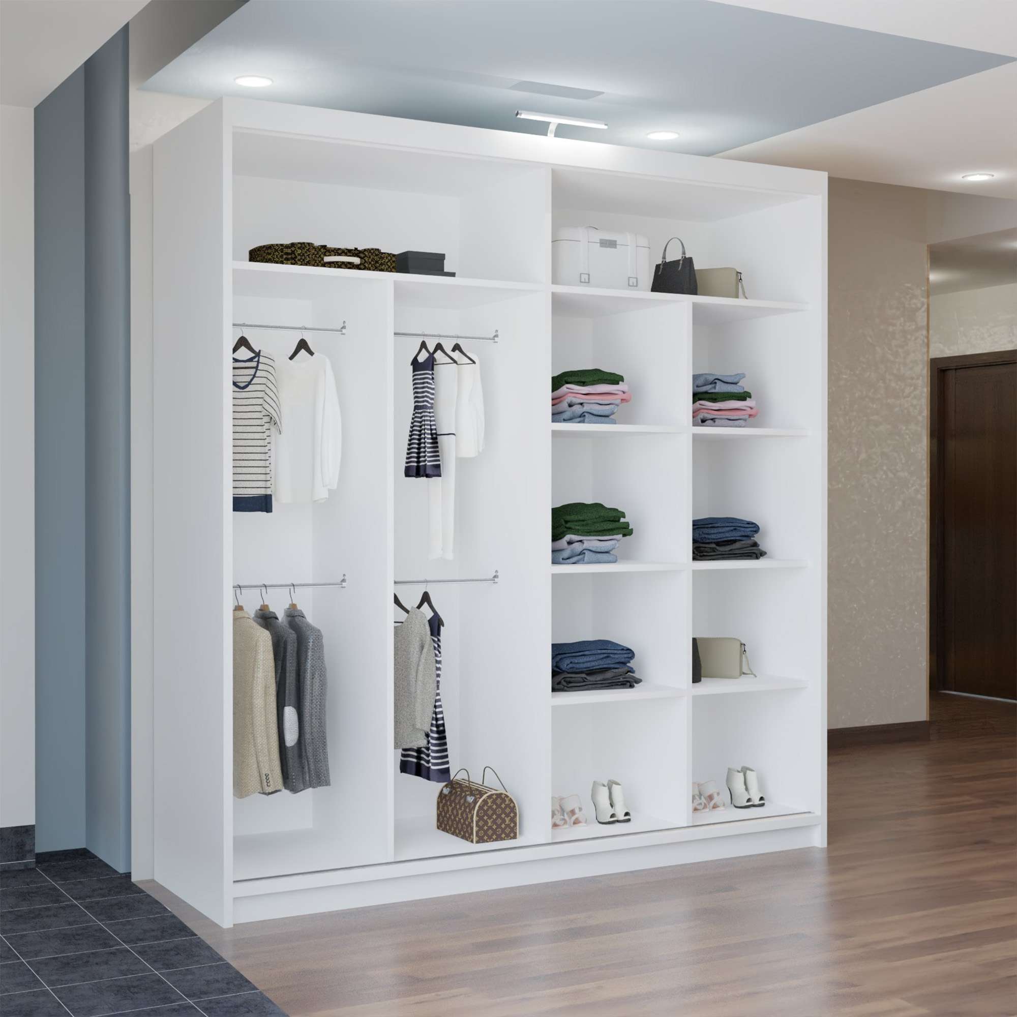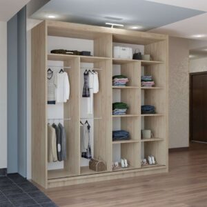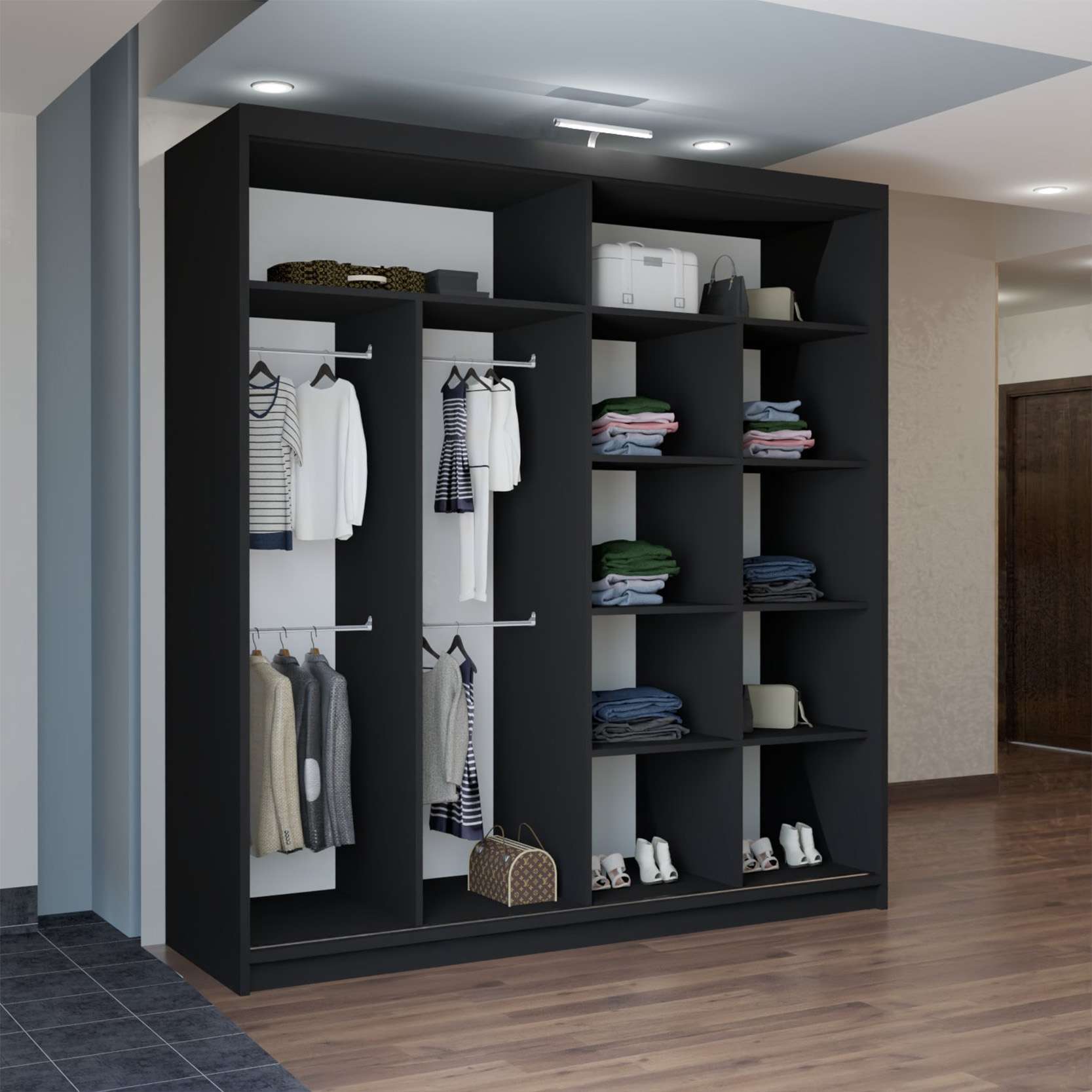 With sliding mirror doors, bright LED illumination and large internal sections, it keeps clothing organised while enhancing room appearance.