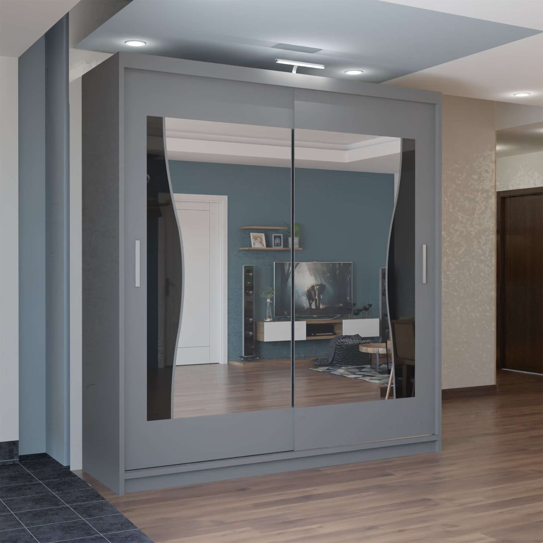 The mirrored doors visually expand smaller rooms, helping the space look wider and brighter without needing renovation.