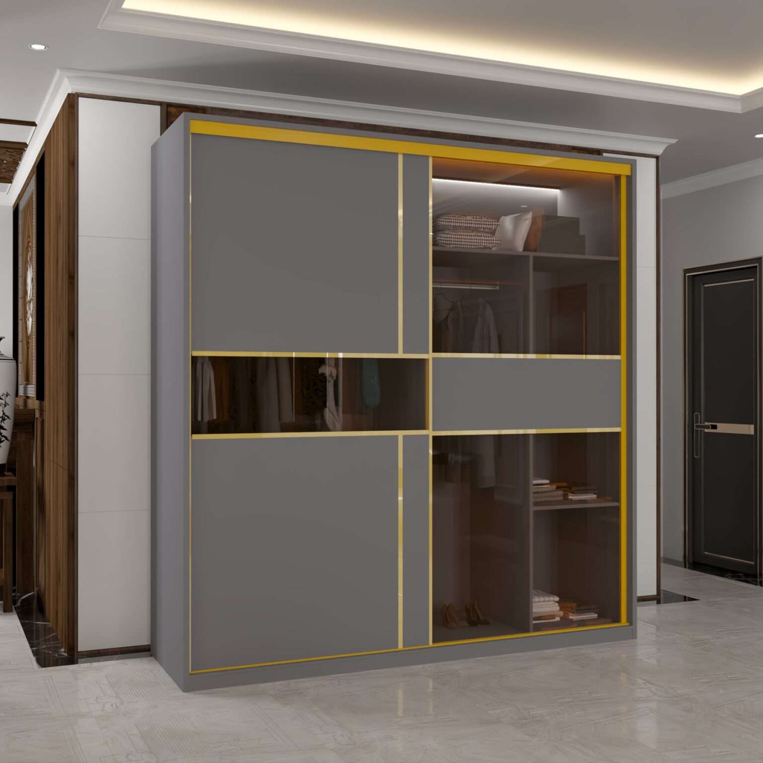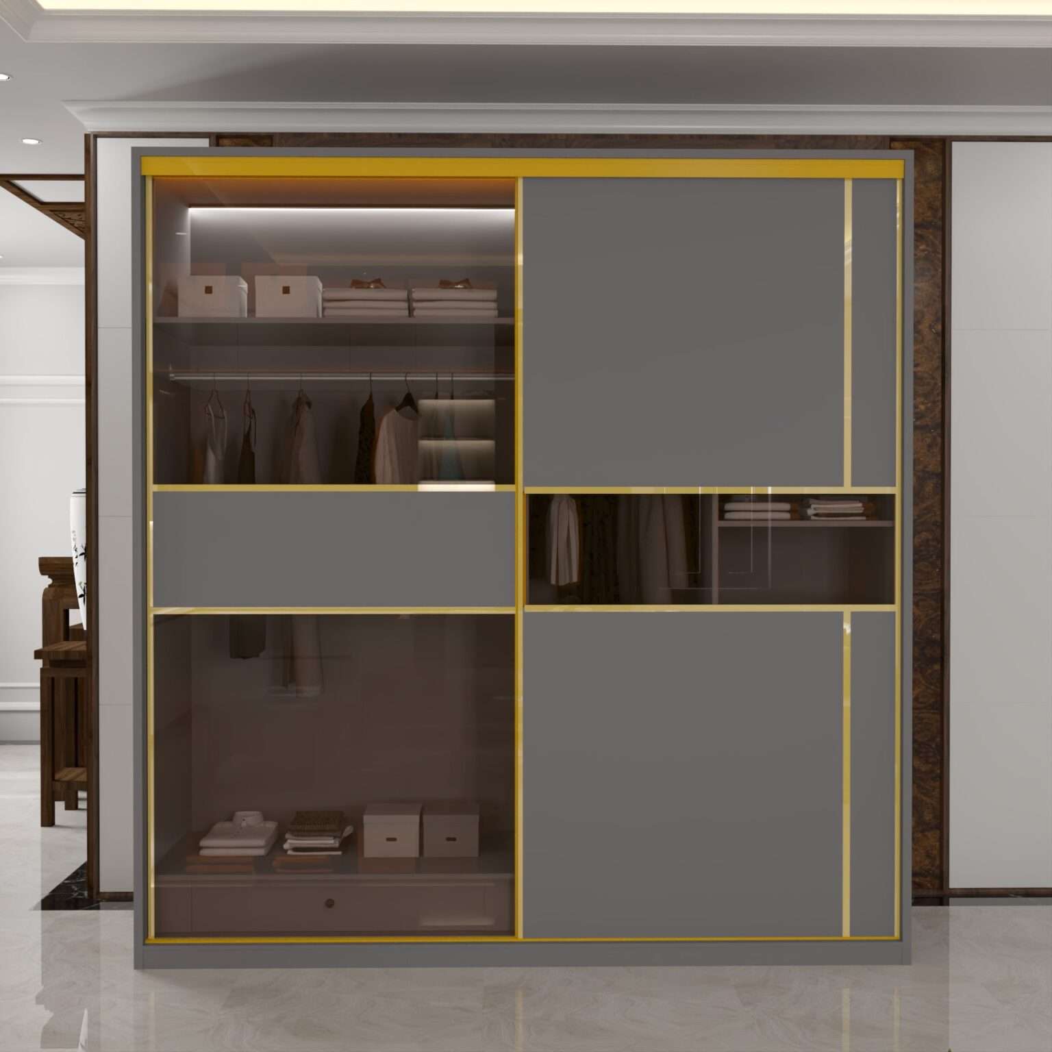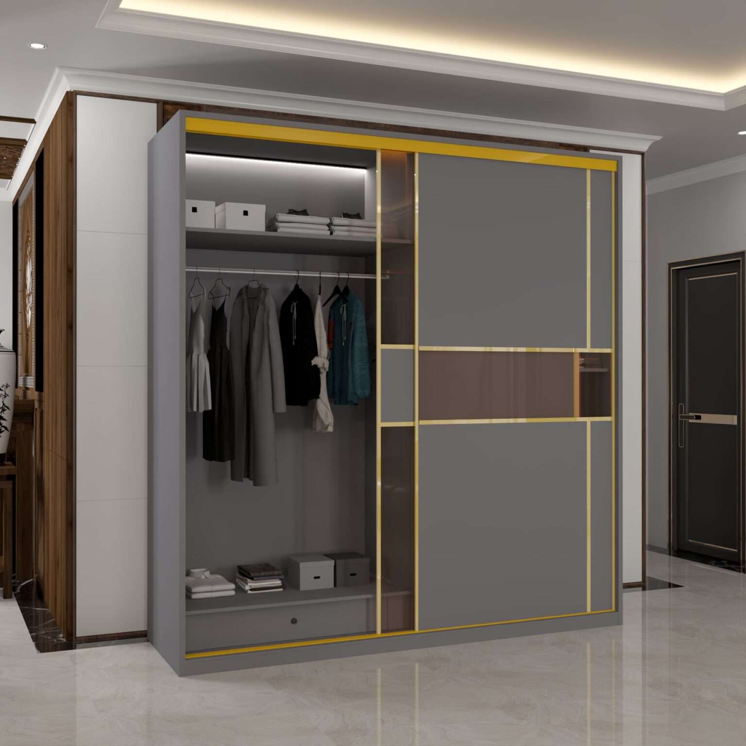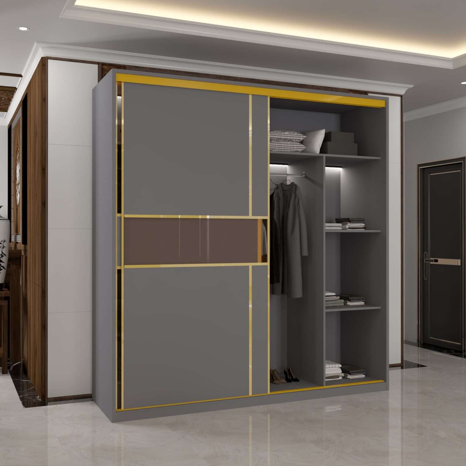 gold trim breaks the monotony of plain surfaces and gives the wardrobe a premium identity.