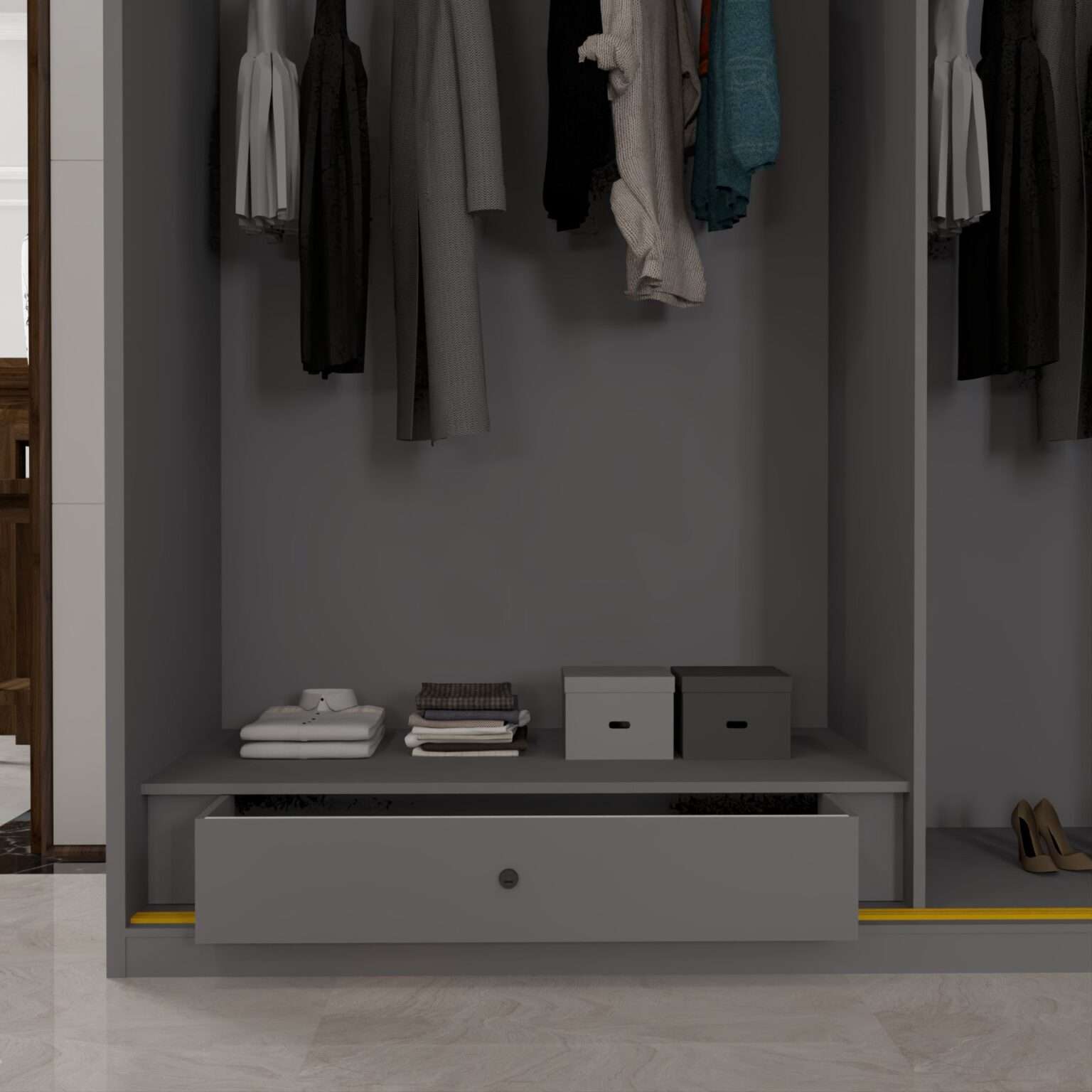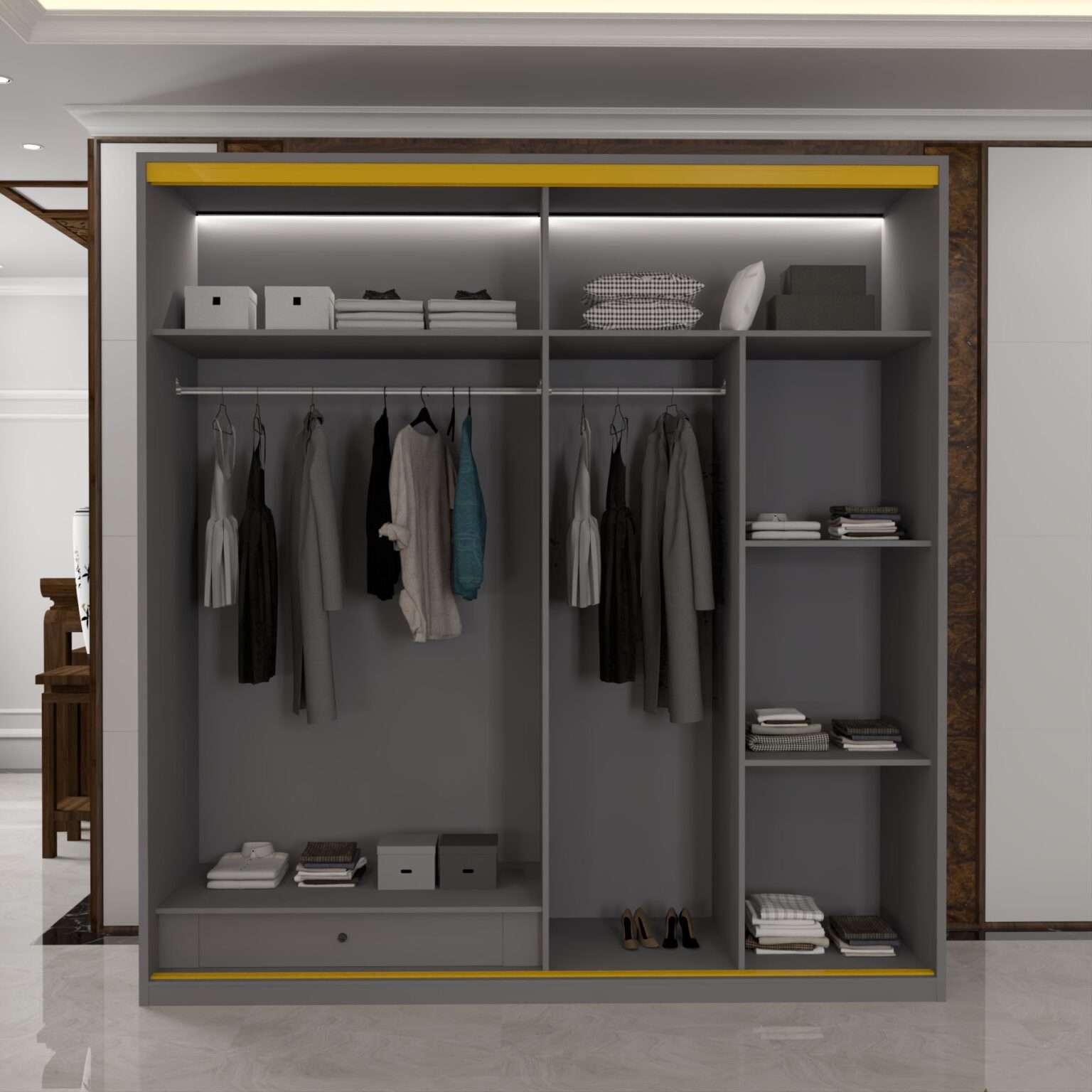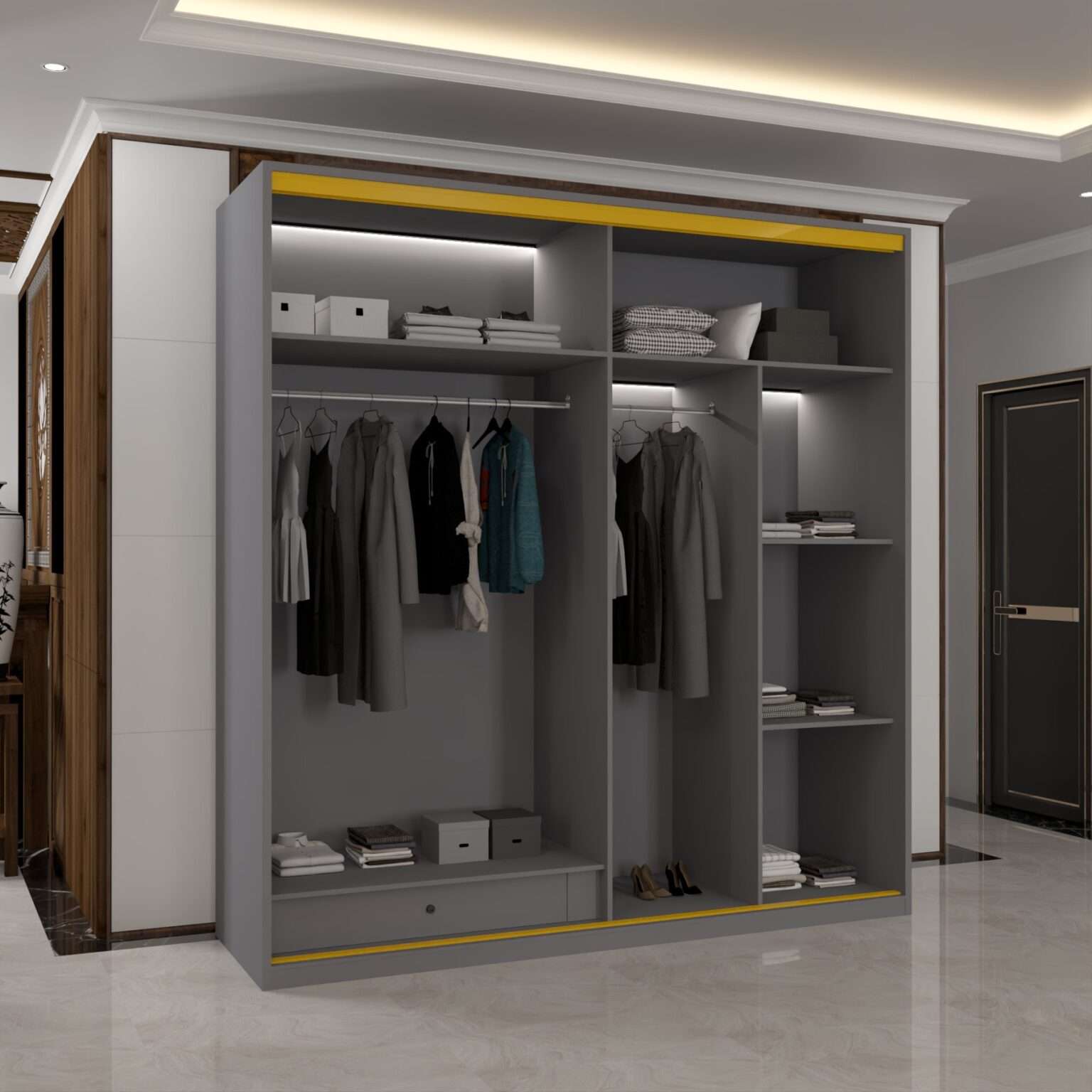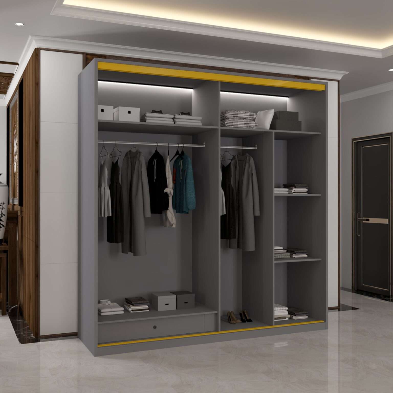 Inside the wardrobe, the layout is engineered for efficiency. Multiple shelves, hanging areas and open