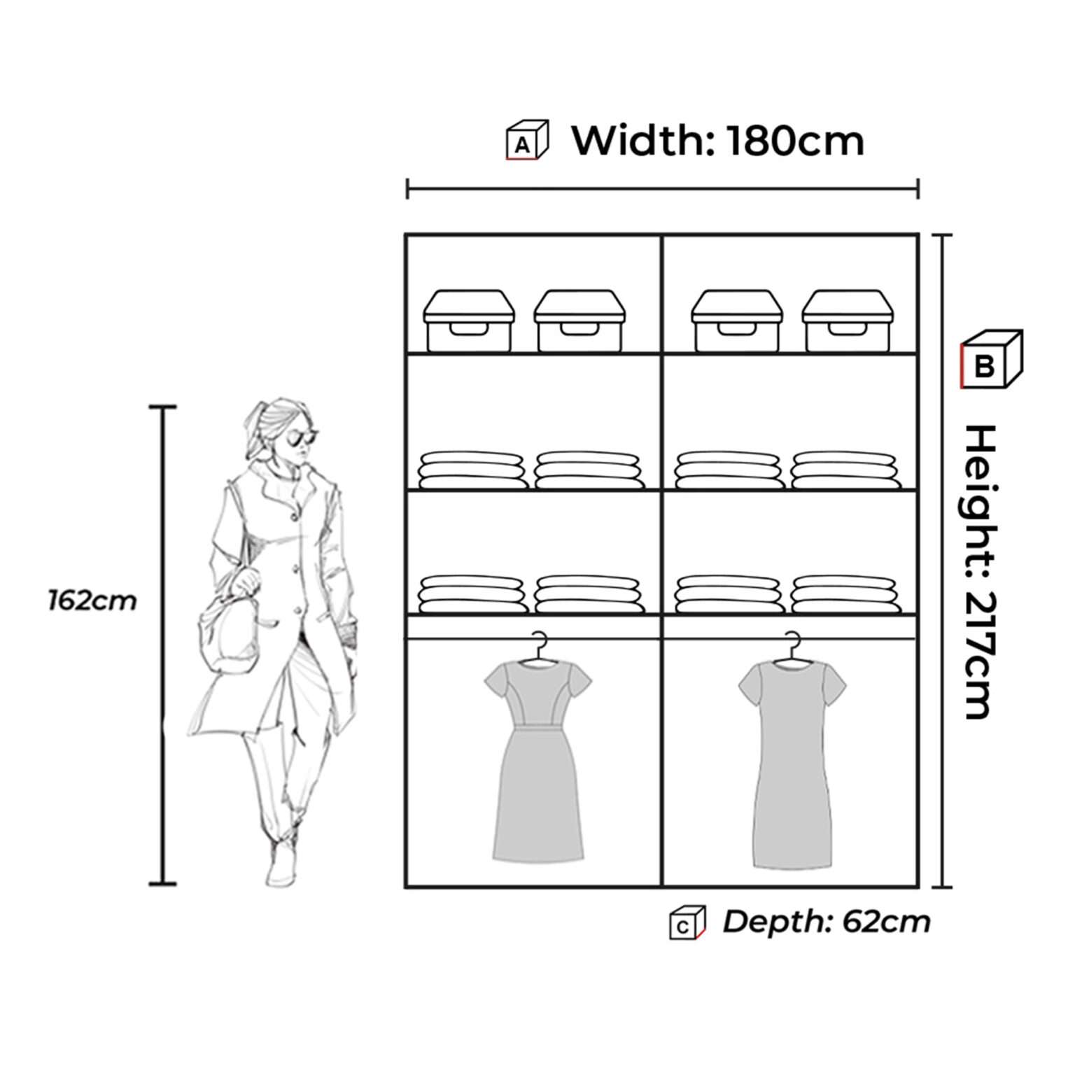 includes shelves, hanging rails and divided compartments that allow you to store clothing, seasonal items, bedding